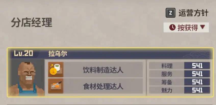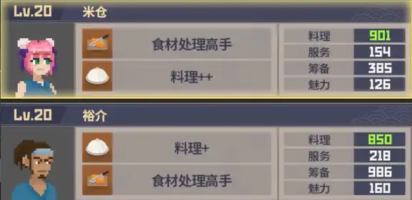 除了这些固定的成长机制,每个员工的属性——料理、服务、筹备和魅力,也会影响他们在不同岗位上的表现。根据这些属性的高低,员工可以大致分为三类:后厨员工、大堂员工和经理。料理直接影响员工的出餐速度,料理数值越高,菜品出得越快,这对于餐厅的运营来说至关重要。服务决定了员工送菜的速度。如果大堂员工的服务数值高,那么顾客等待菜品的时间就会大大缩短,提升顾客满意度。筹备指派员工去进行资源收集时,筹备数值越高,员工带回的物品就会更多,例如有些员工可以带回更多的食材、材料,这对于长期的餐厅运营至关重要。魅力影响员工派遣时获得的物品数量,魅力高的员工,派遣后能带回更多的资源,甚至可能影响顾客的耐心度,减少差评。