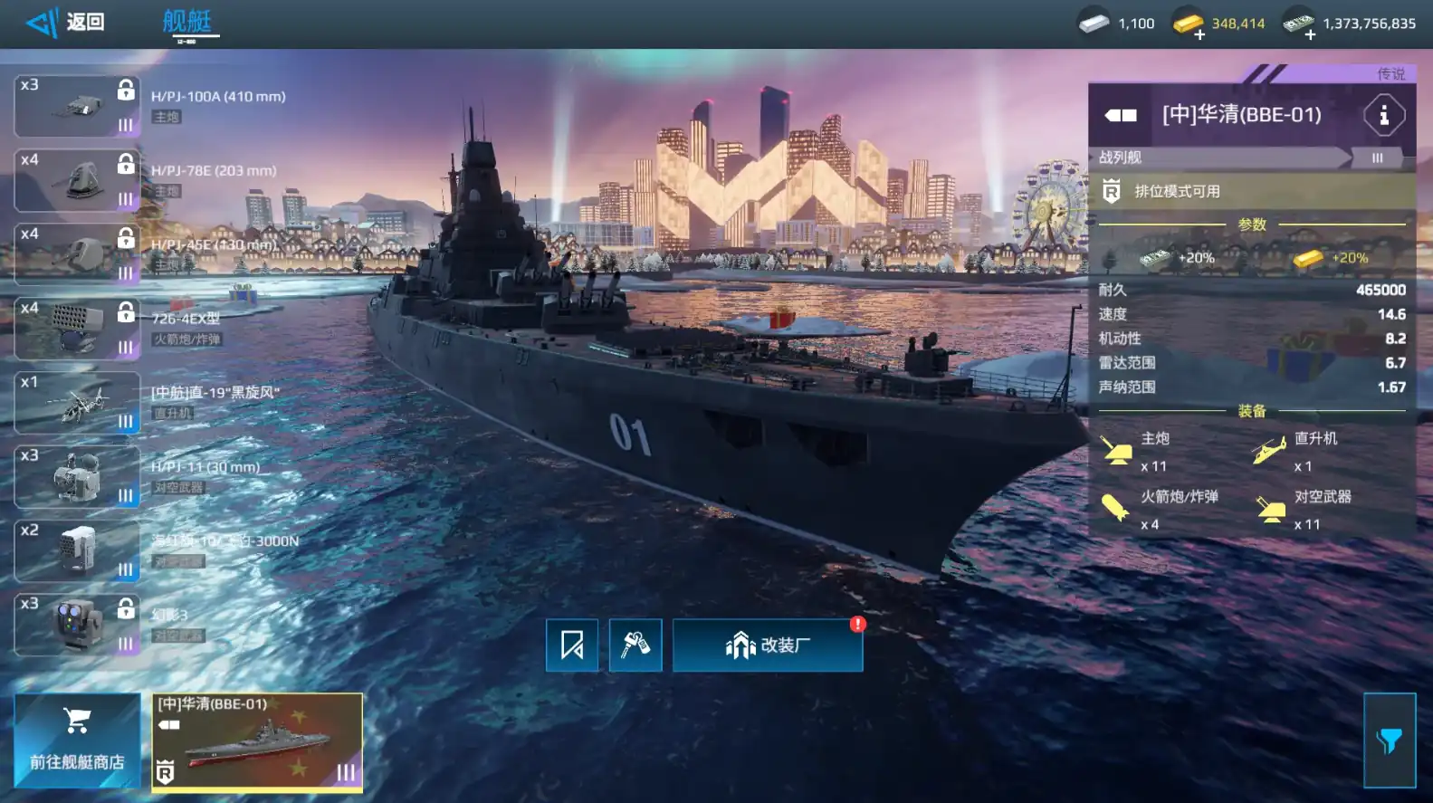 该舰配备了- 配备了三门电磁炮,与罕见水平相当,同时还配备了利刃同款的二号舰炮和升级版的黄浦江,火力输出强大。而且华清舰的耐久非常高,满改后甚至超过了满级的大河,是目前游戏中耐久最高的战舰之一。