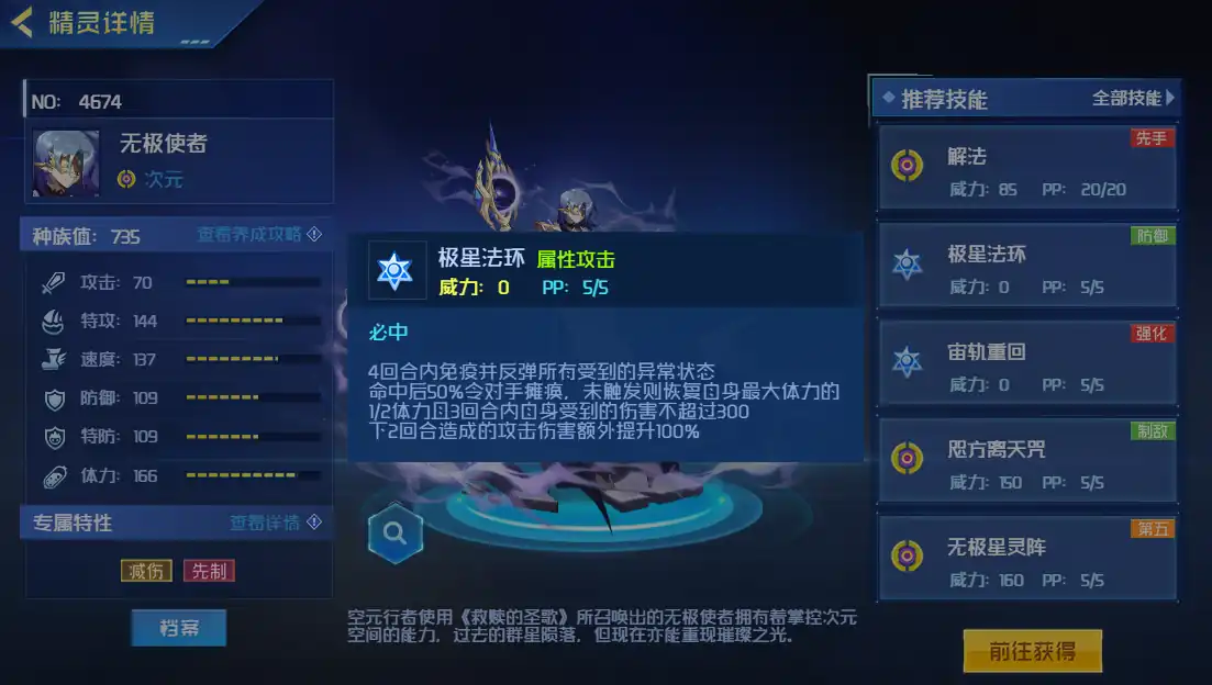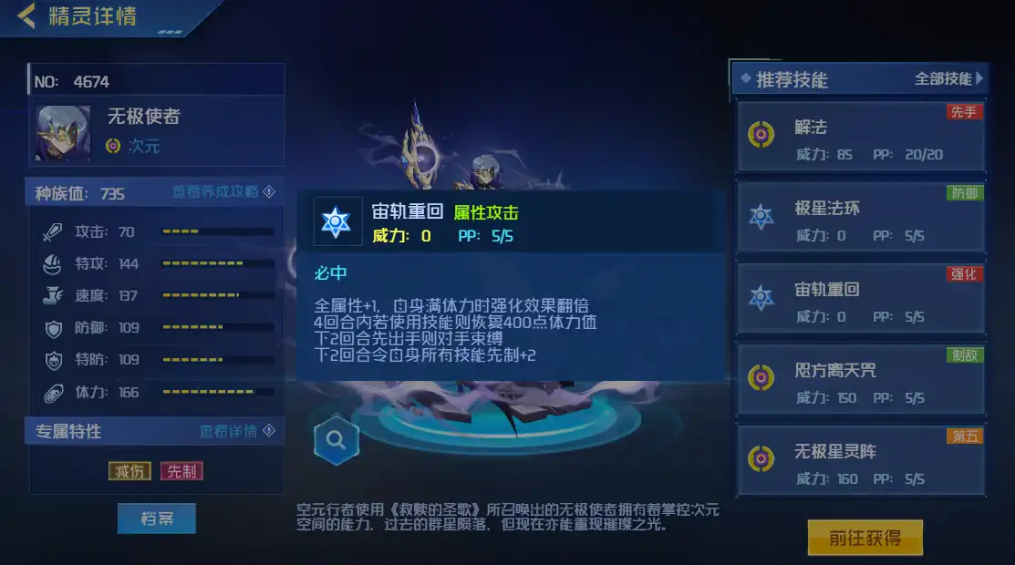 然后还有一招宙轨重回,用了之后可以让自己全部属性加一,若是满体力的话效果还会翻倍。在四回合内使用的话还可以恢复大量的体力值,并有机会束缚这对手。然后还可以使用咫方离天咒,作为一招特殊攻击,自己能力下降时附加300点固定伤害,并解除异常状态。若对方处于异常状态的话,可以造成双倍伤害,并减少对方的防御提升。