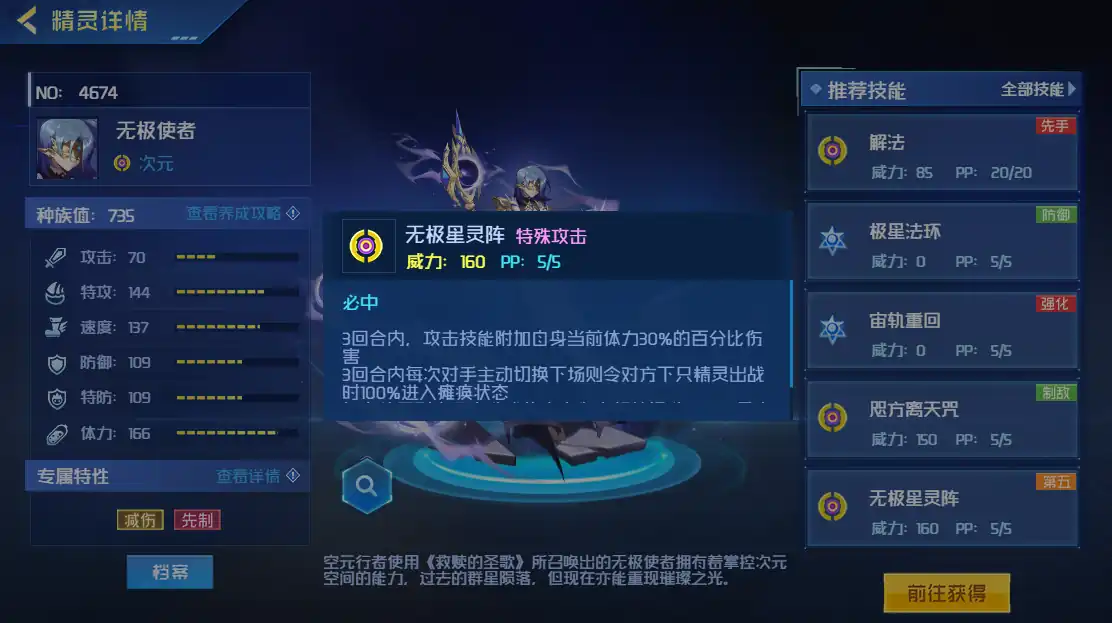 接着还可学习无极星灵阵,这同样是特殊攻击。攻击技能可以附加当前体力的30%伤害,如果对方主动切换至下场的话就会处于瘫痪状态。并且能额外提升30%的攻击伤害,最高额外提升120%。