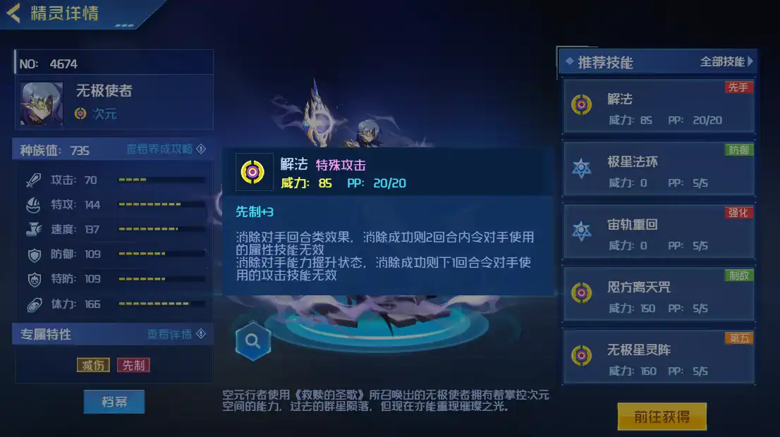 他的特殊攻击叫做解法,获得三次先制。并能够消除对手的回合类效果,消除成功两回合的话可以让对方的属性技能无效化。然后还会消除对方的能力提升状态,并让对方的下次攻击无效化,总之就是能够削弱对方的能力,并增强自身的攻击。