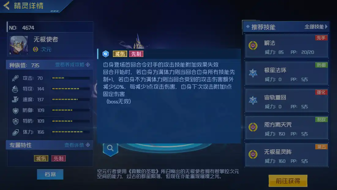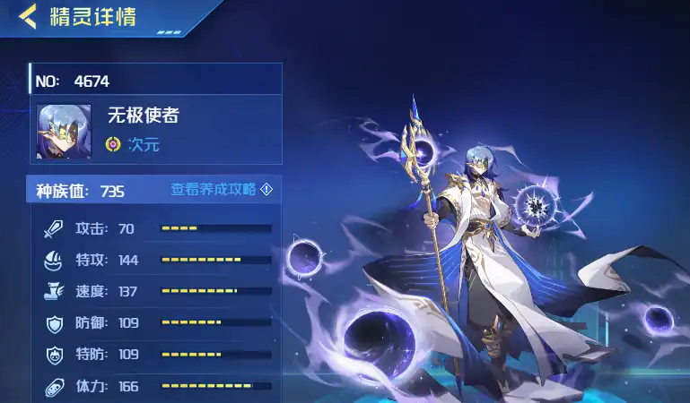 首先无极使者可以使用强大的次元空间能力,并可以召唤来自过去的群星,在这个位面中还带有一定的占卜能力。是一个充满智慧的角色,有他存在的话就可以重新绽放无上的光辉。然后自身的种族值也高,还带有一定的攻击力和攻速,自保能力强。