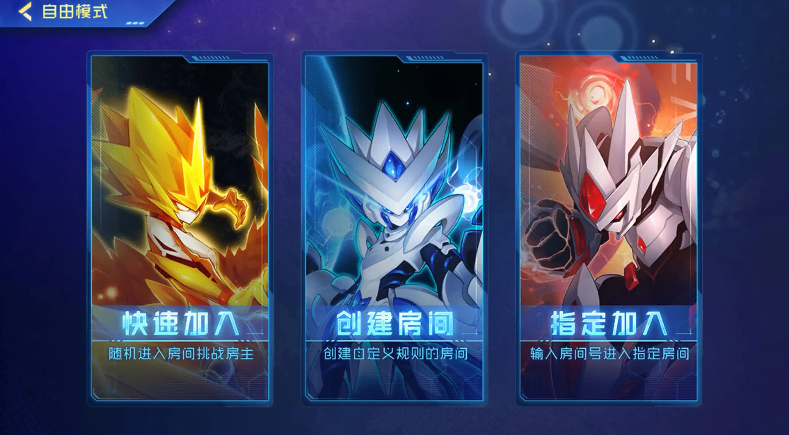 巅峰圣战一共分为三个玩法,第一个是自由模式,在这个玩法当中,玩家能随机加入其他人创建的房间,接着就能去挑战房主了,如果你是和好友开黑,那么可以自行创建一个房间,也能通过输入房间号,进入你朋友建立的对局,然后就能与好友一起在线去进行对抗了。