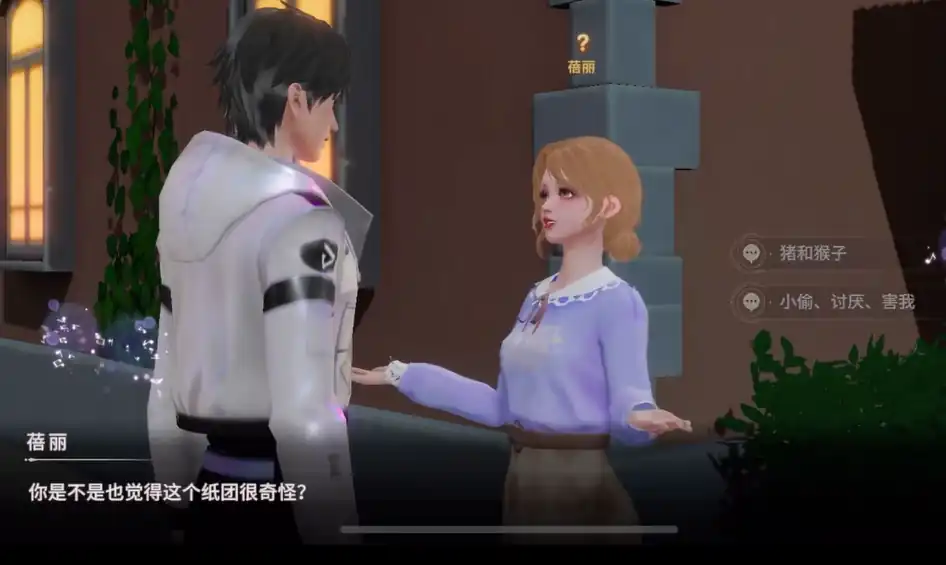 这个纸团的谜题有三个,第一个谜题的位置在城中心npc蓓丽附近的草丛,玩家们在草丛进行拾取的时候会获得一张乱七八糟的纸条,找到之后跟蓓丽进行对话,这时候npc会跟玩家们进行短暂的角落,在角落的时候会有两个选项,玩家们需要在选项中找出答案,选择猪和猴子的选项就可以了,这样第一天的谜题系列就能完成。