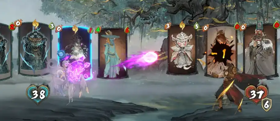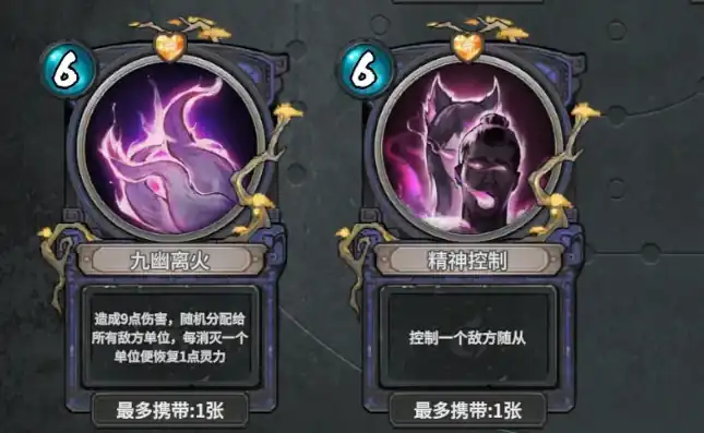 此外也可加入九尾灵狐卡牌,能够将所有的敌人随从攻击力降为一点。然后把它再一次放入你的牌库里,重新洗一遍。还有九幽离火,可以直接对敌人造成9点伤害。不过会随机分配给所有敌方单位,若是对方阵亡的话就可以恢复自身一点灵力。