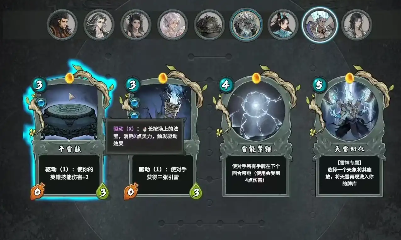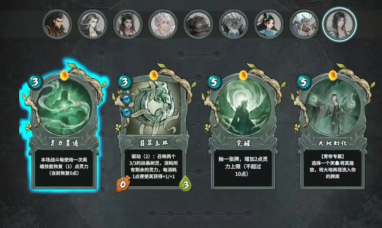 最后就是青帝句芒,拥有的牌包括觉醒,灵力贯通,翡翠玉环,生机之地,混沌之灵,时光之源,奉献,扶桑神树等。青帝专属的是大地幻化,可选择一个天象将其释放,在将大地再现洗入牌库中。扶桑神树,战斗剩余时间内,每当召唤扶桑树灵,就能使其获得加3,这张卡牌可以说是青帝强度高的主要原因。觉醒,抽一张牌增加两点灵力上限,最多不超过10点,灵力贯通,本场战斗每使用一次英雄技能恢复一点灵力。翡翠玉环,召唤两个3-3的扶桑树灵,消耗所有剩余灵力,每消耗一点便使其获得加一。