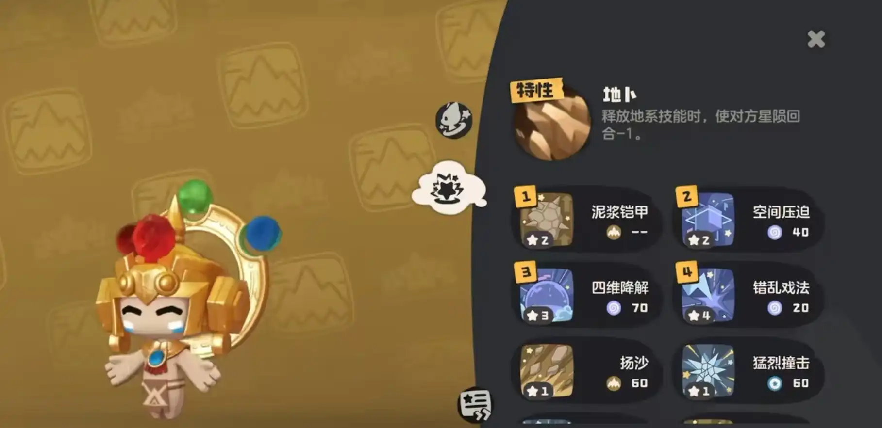 仪式之星的特性是地卜,效果是释放地系技能时,使对方星陨回合减一。主要的精灵技能有一下几个,第一个扬沙,对敌方精灵造成物理伤害,第二个猛烈撞击,对敌方精灵造成物理伤害,第三个是空间压迫,造成物理伤害,并且赋予1层星陨效果。第四个是魔法增效,提升80%魔攻属性。第五个是地刺,不仅能造成物理伤害,应对时更是可以打断敌方。第六个是坍缩,造成魔法伤害,敌方星陨回合数减一。