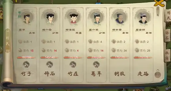 一开始村民的初始劳动值是十五,村民刘长英还有柳大富都是合适的选择。选择其中的一个村民在点击确认后就可以选择对应的资源点,接着就可以进入到采集的阶段,木材可以自动的采集。