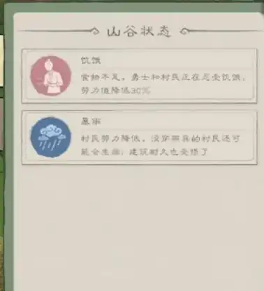 每一个季节的天气也会有区别,春天经常性有小雨,夏天会有暴雨,还有高温天气,秋天则比较舒适,冬天则会有鹅毛大雪。每天还会有30%的几率,会出现一些特殊的天气,例如暴雪或者是雷雨,这些天气就会导致村民的健康,还有生产效率都会受到影响。