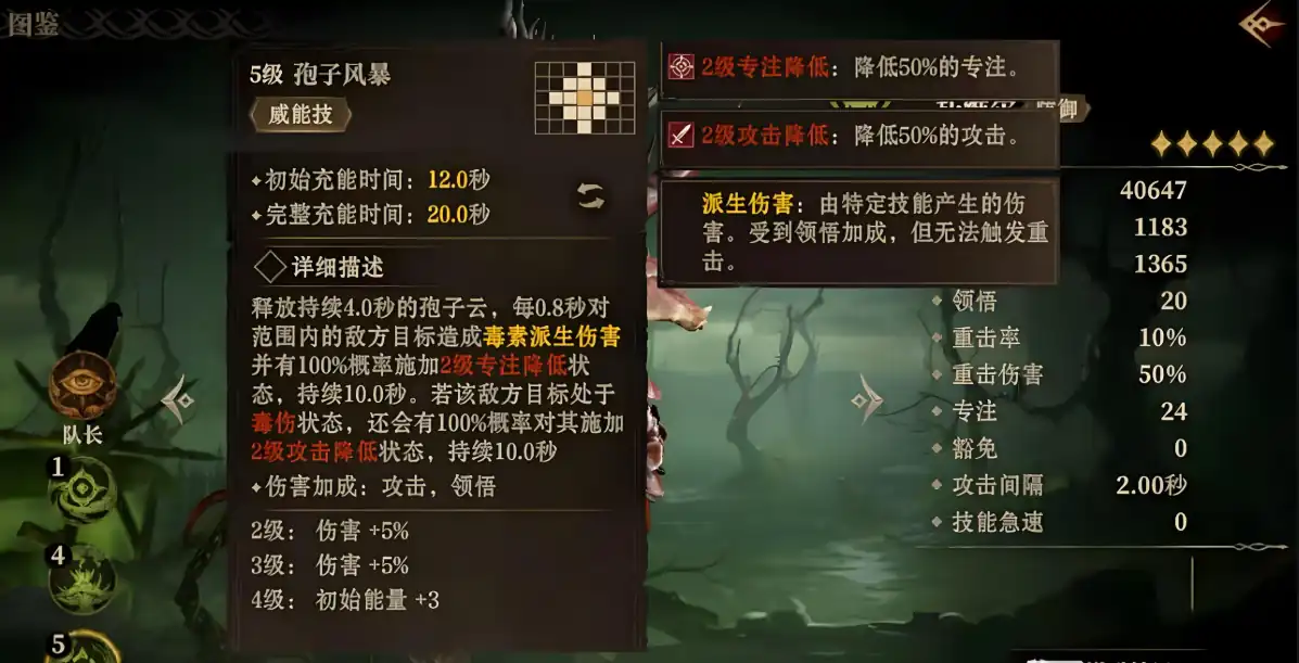 托维尔的威能技“孢子风暴”是他输出和控制能力的另一大亮点。该技能在释放时会持续4秒,形成一个毒素云,敌人在范围内的每0.8秒都会受到毒素派生伤害,并且每个敌人都100%会被施加两级的专注降低状态,持续10秒。更为强大的是,当敌人已经处于毒伤状态时,托维尔还会施加两级的攻击降低效果,进一步削弱敌人的输出。这使得托维尔不仅能够对敌人造成大量伤害,还能有效地降低敌方的攻击能力,极大地提升了他在多人战斗中的作用。通过合理运用这个技能,托维尔能够在团战中创造巨大的伤害输出并有效控制敌人的输出能力。