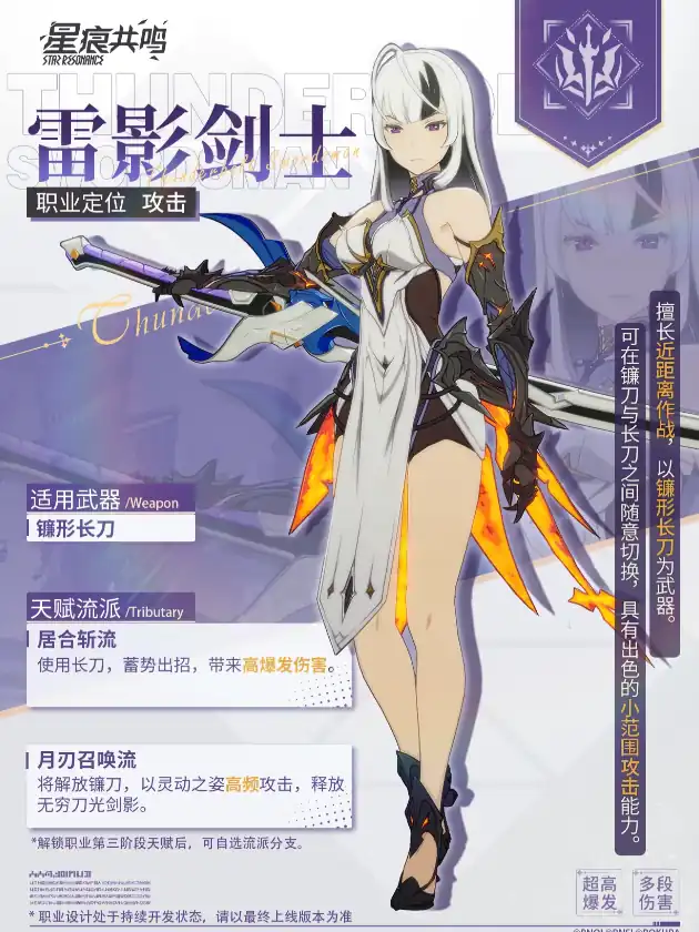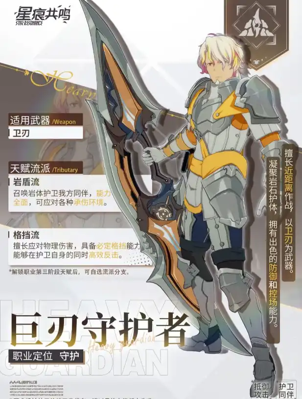 ①巨刃守护者。定位为守护,坦克角色。其特点是以护盾为核心,能力全面,可以应对各种承伤环境。操作难度较低,适合新手玩家。技能机制简单易懂,同时也有一定的输出伤害。②雷影剑士。定位为攻击角色。其特点是善长近距离作战,使用镰形长刀,适合喜欢高难度的玩家。可以选择居合斩流或月刃召唤流,前者注重高爆发,后者注重高频次攻击。