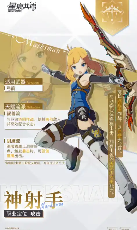 ③雷影剑士。定位为攻击角色。其特点是使用长枪,攻势凌厉,机动性强。操作难度中等,适合喜欢快速攻击的玩家。有重装流和空战流两种玩法,前者攻击迅捷,后者能规避地面攻击并从空中攻击敌人。④神射手。定位为远程攻击角色。其特点是擅长远距离作战,使用弓箭。操作难度较低,适合喜欢远程攻击的玩家。拥有驭兽流派和驯鹰流派,前者通过巨狼吸引火力,后者通过标记触发暴击。