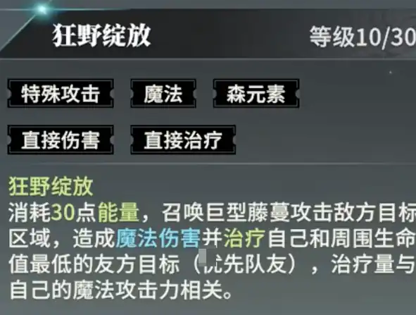 首先,关于其相关技能的介绍。①掌控藤蔓是森语者的基础攻击方式,通过施放特殊攻击和一些职业技能时必备的资源,每秒自动回复能量,初始上限为一定数值。这种资源管理机制要求玩家在战斗中灵活运用普通攻击进行连续攻击,造成魔法伤害。②狂野绽放是森语者的特殊攻击技能,会召唤巨型藤蔓攻击敌方目标区域,造成大量魔法伤害的同时治疗自己及周围生命值最低的友方单位。治疗量取决于施法者的魔法攻击力强弱。