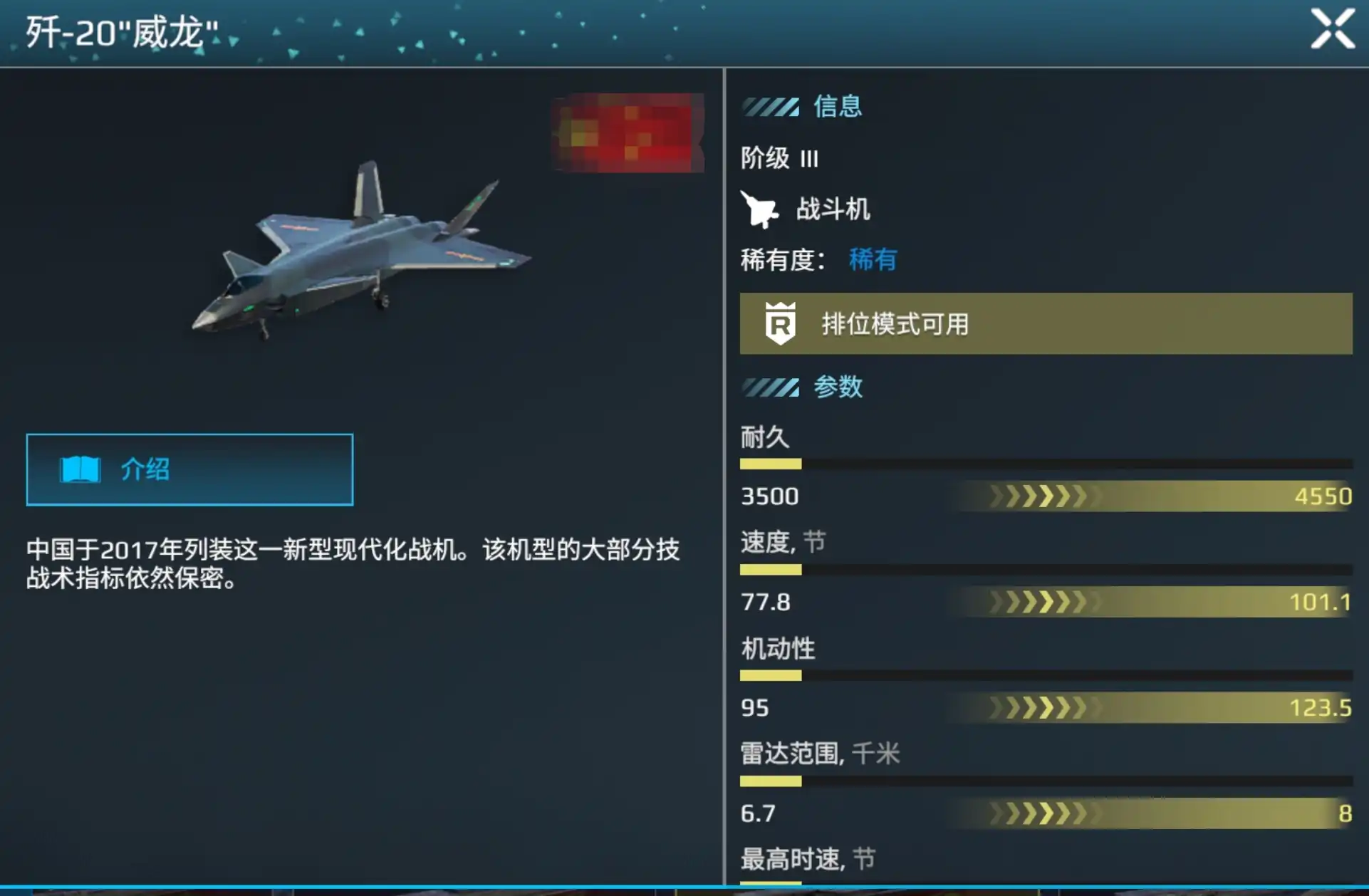 歼20装备了先进的雷达和远程空空导弹,具备超视距打击能力,在战斗中,玩家要充分利用这一特点,与敌方保持一定的距离,通过雷达探测到敌方目标后,在敌方武器射程之外发射导弹进行攻击,这样能有效地避免与敌方近距离接触,降低自身被攻击的风险。