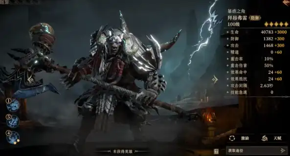 其次,在技能介绍方面。其被动技血怒在释放技能后,下一次普通攻击将改为释放怒吼,嘲讽范围内的敌方目标,持续3秒,并造成闪电派生伤害。同时,对自身施加一个相当于最大生命值10%的护盾,持续10秒。这个技能不仅能够对敌人造成伤害,还能有效提升自己的生存能力。其战技千钧震怒会对自身施加免疫控制状态,持续5秒,并举起巨斧开始蓄力。蓄力结束后,对范围内的敌方目标造成高达330%攻击的闪电伤害,并有75%的概率施加眩晕状态,持续3秒。这个技能在人群中释放能够造成大量的伤害和控制效果。其威能技激雷流电可以对范围内的敌方目标造成520%攻击的闪电伤害,并对自身施加2级防御增加状态,持续10秒。同时,自身进入带电状态,持续10秒,期间每1.25秒对随机敌方目标发动电击,造成100%攻击的闪电伤害,并有100%的概率施加眩晕状态,持续1.5秒。这个技能不仅提高了拜昂弗雷的防御能力,还能对敌人造成持续的伤害和控制。