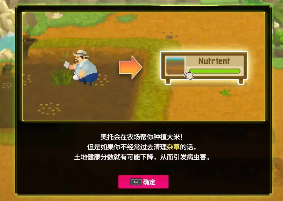 游戏中,当你与一位挑剔的VIP顾客打交道时,他会点名要一道需要大米的料理。这个时候,剧情会触发,你的助手奥托会很贴心地赠送你一片农场。从此,你的稻田将成为大米的主要来源,而且还能实现自动化种植,解放双手。