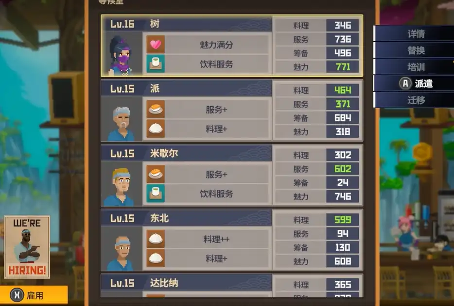 另外,不同员工有不同的潜力和擅长领域。如果一个员工已经被培养得很强大了,比如烹饪速度快、工作效率高,那他对寿司店的帮助绝对是不可替代的。在这种情况下,迁移他基本等于在给自己挖坑。所以,迁移功能适合那些属性平平、对团队帮助有限的员工。用这种方法来优化团队阵容,腾出位置招募更优秀的人选,才是合理利用迁移功能的正确打开方式。