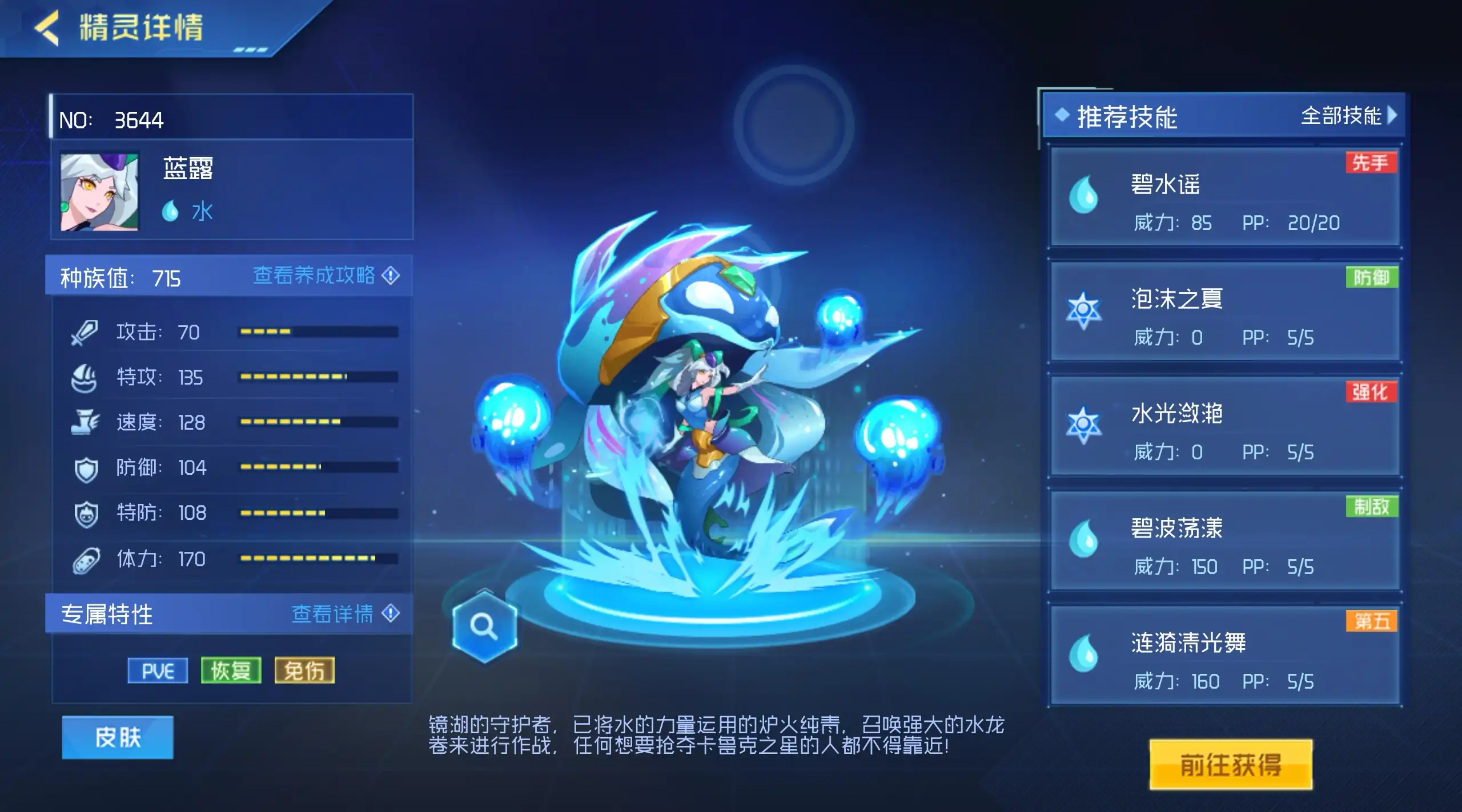 在选择技能时,大家可以优先考虑水光潋滟、泡沫之夏、碧水谣、碧波荡漾和涟漪清光舞这几个招式,水光潋滟是一个必中技能,能提升精灵的各项属性值,泡沫之夏则是一个防御技能,能够帮你抵御对手释放的异常状态攻击,还会形成一个护盾,帮你吸收受到的伤害。碧波荡漾则能冰封对手,限制敌人的行动。碧水谣则能干扰对方,使其无法正常地提升属性值。涟漪清光舞是一个高输出的必中技能,不仅能解除自身能力下降状态并恢复全部体力,还能对敌方造成大量伤害,当伤害高于300时,接下来的2回合,对手使用的属性技能都会失效,低于300时伤害会进一步增强。
