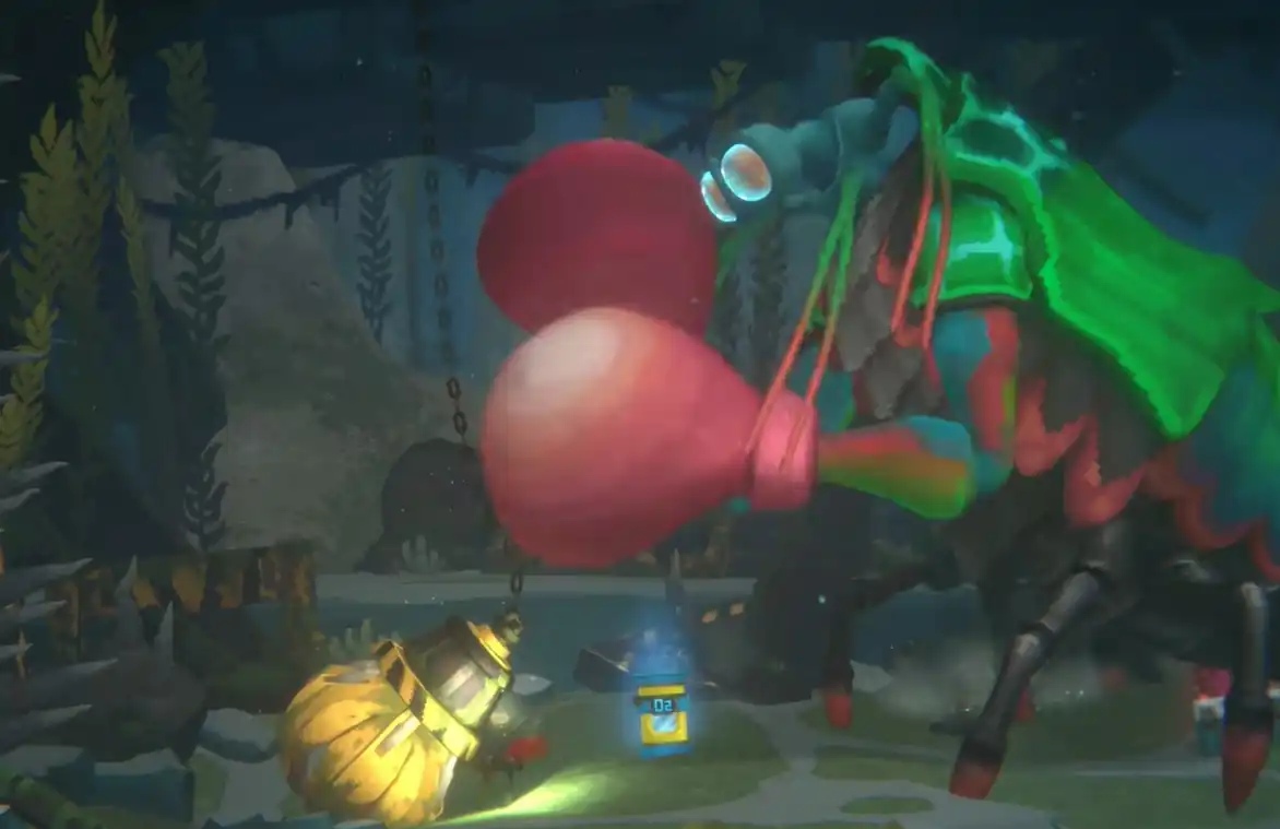 存在于暴风雨之夜约30米左右深度的漩涡中,是一只带着拳套的螳螂虾,拥有着非常快速的出拳速度,大伙可躲在地图中的铜球下方,这样就能规避掉它的所有攻击,等它疲惫时再出去攻击它的眼睛。