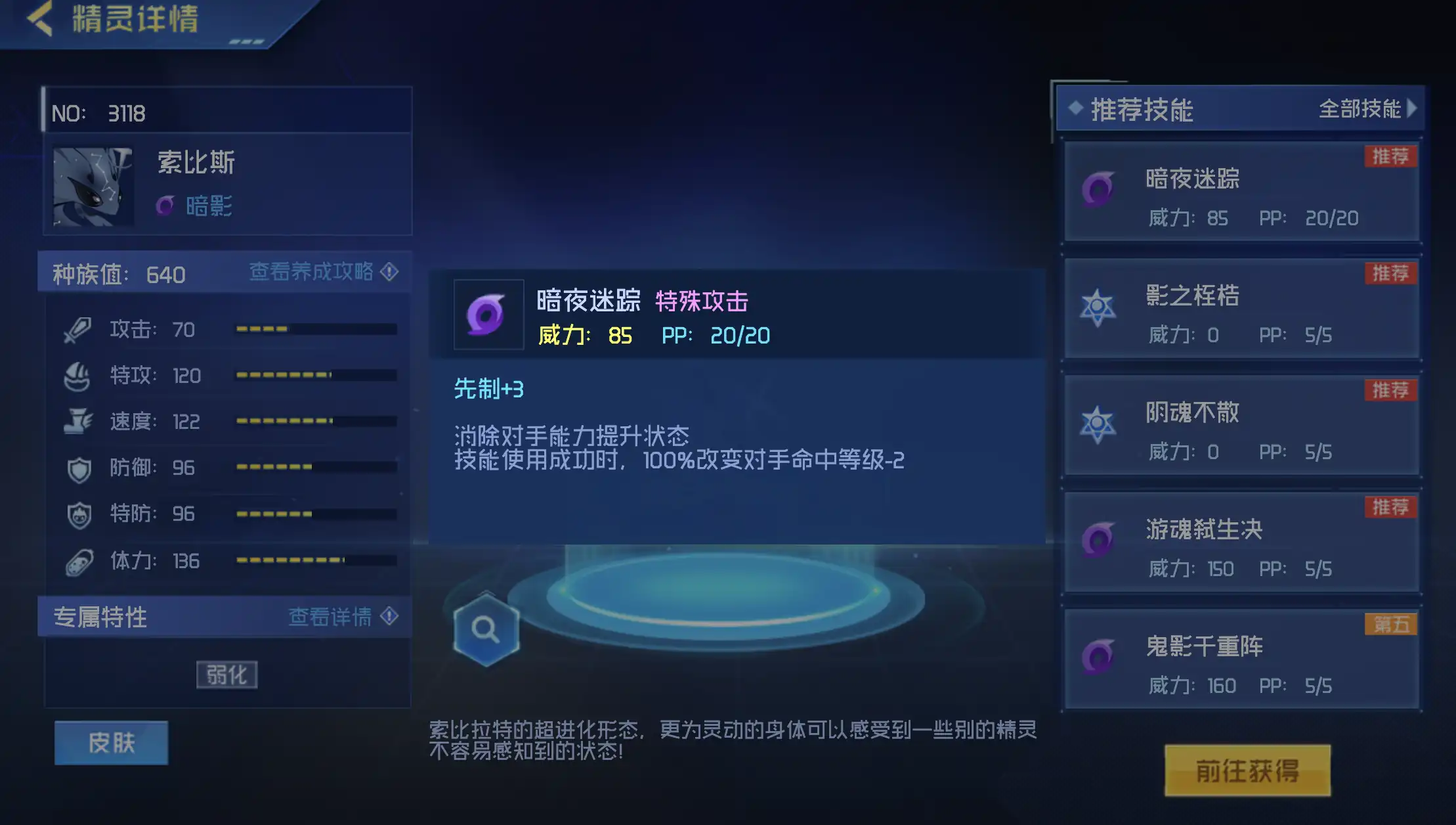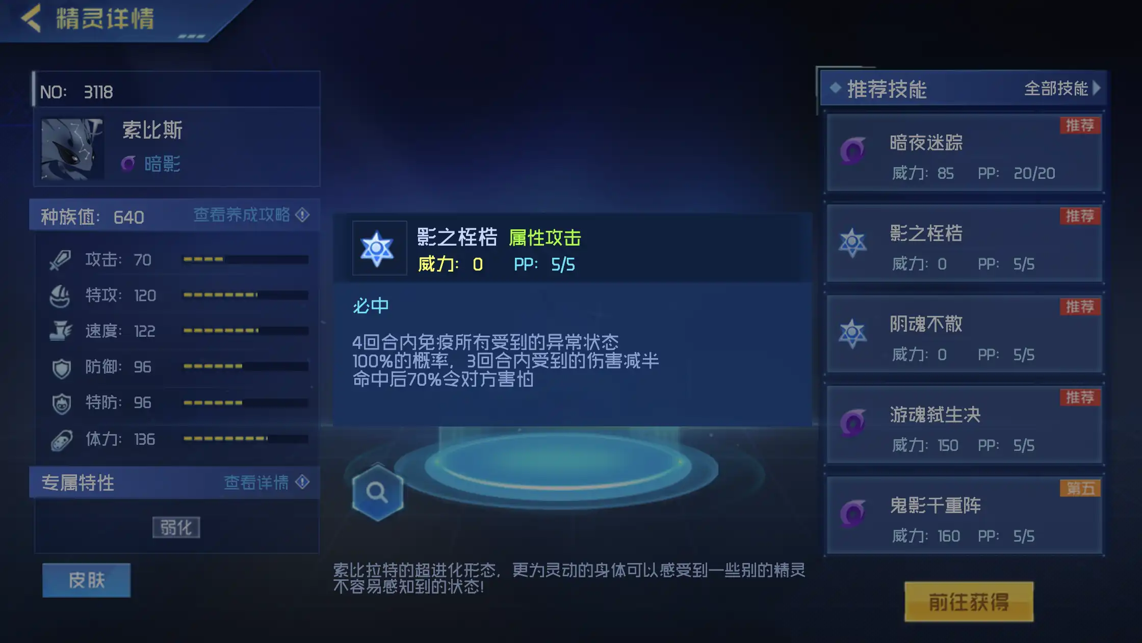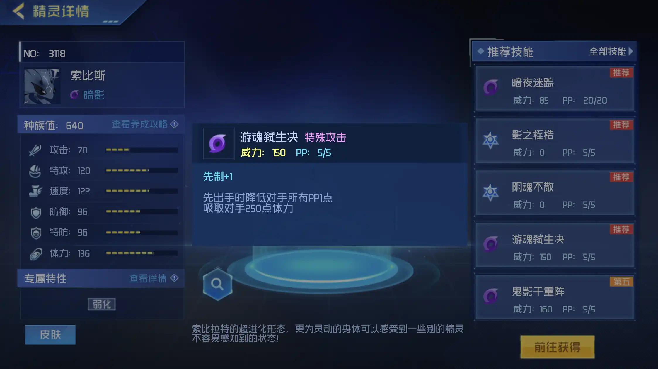 先制+1的特性使其能够优先出手,且能降低对手所有技能的PP值1点,吸取对手250点HP。这不仅为索比斯提供了不错的续航能力,还能削弱敌方的技能资源。