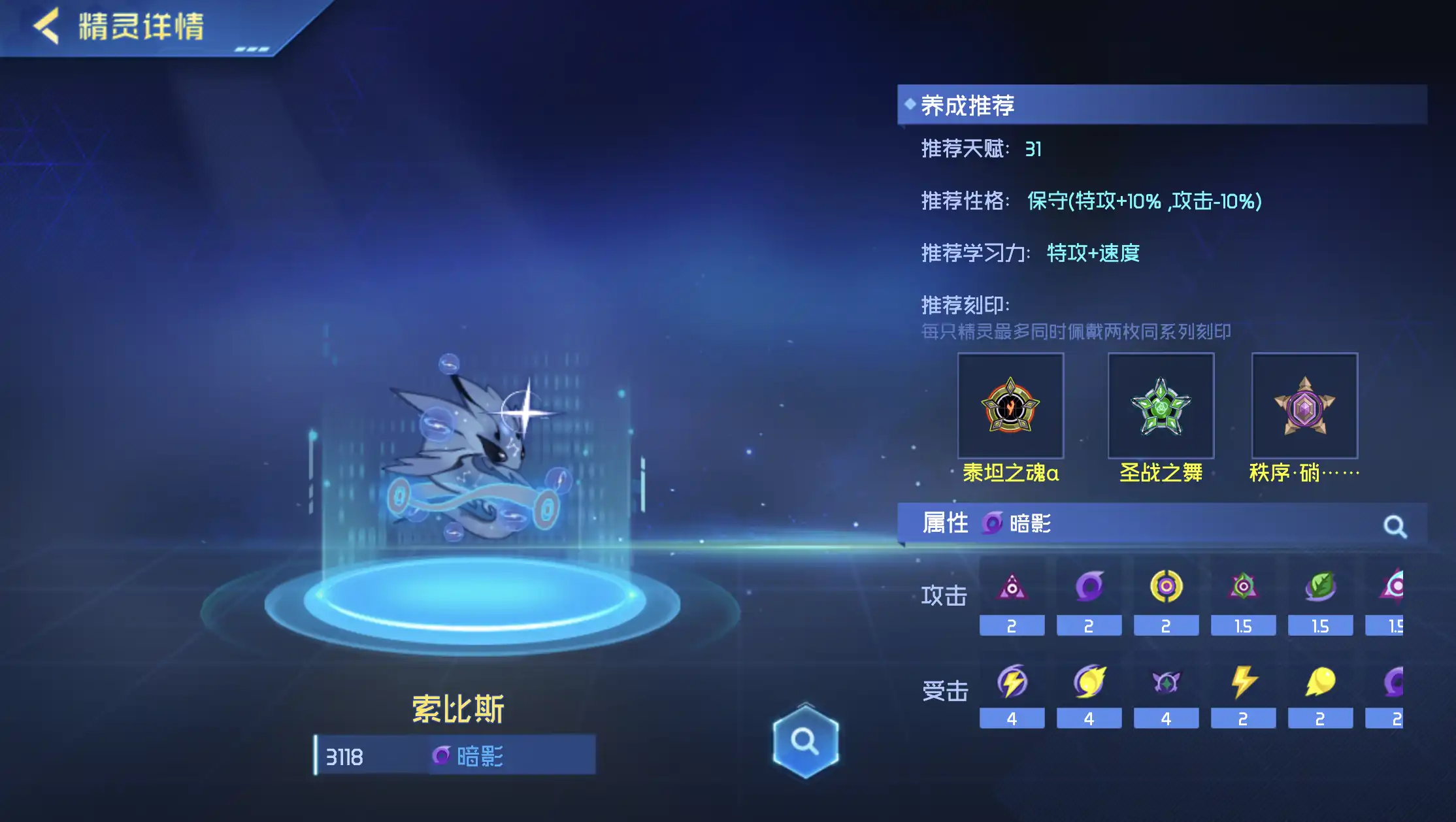 索比斯的魂印“黯”是其核心亮点之一。当索比斯被击败时,可以清除对手的强化状态,并使对手在接下来的两回合内攻击伤害减半。这一效果为团队提供了强大的反制能力。在不利局势下,可以选择战略性牺牲索比斯,通过魂印的效果清除对手强化,并削弱其伤害,为后续精灵争取优势。