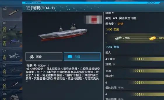瑞鹤:市场价格为2万黄金,各项基础属性都会处于中等。各项基础属性都会处于一个中上等的水平,会配置两个导弹一个战斗机以及一个无人机。血量比较高,速度较快,配置比较全面,而且会拥有着广泛的用途。