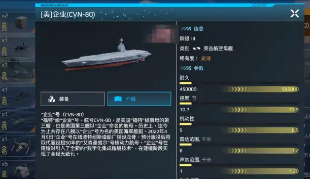 企业:拥有出色的耐久性,售价为1亿2,000万美金,但是机动性还有速度都会比较差。配备两个火箭炮,还有轰炸机以及战斗机就会成为一个均衡的航母,防空火力还是非常充足的,只是在转移的时候位置会有一些困难。