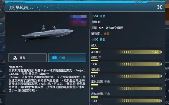 暴风雨:市场价格为8,000万美金,各项基础属性都是中规中矩的,会有两门火箭炮,还有一架战斗机以及攻击器。火力比较强,会拥有大范围的伤害以及高额的伤害,不过空中的输出能力会有所欠佳。
