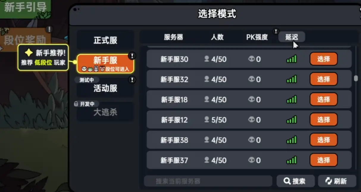 要体验一下的社交玩法,需要玩家至少达到10级,这时候大家就可以在游戏的服务器选择区块里,选择新手区或者活动区。可以看到有很多个新手服,每个服可以容纳一定的人数上限。
