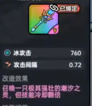 那么来看这法杖,首先要带大家看的是这法杖自身的效果,分析单件法杖的强度,从它自身的效果去看,这法杖是非常强的,它可以释放一个继承角色90%全属性的潮汐之灵辅助战斗,这是一个什么概念?