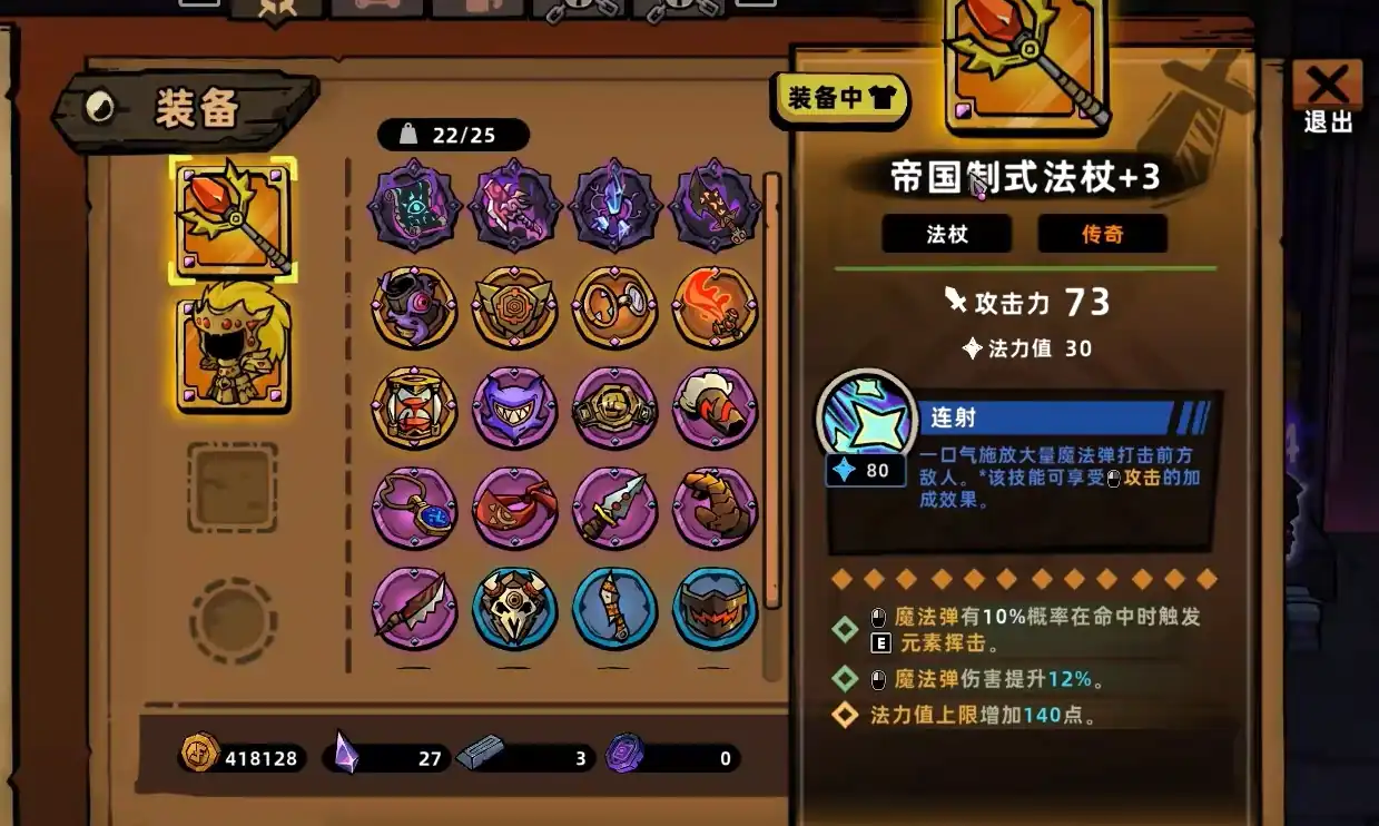 游戏中每个关卡玩家都需要击败很多的小怪才能够继续推进,许多玩家使用的武器无法造成范围性伤害导致每个关卡都需要花费非常多的时间,这里小编建议玩家使用帝国制式法杖,这件武器不仅有非常高的伤害加成,同时还能够让玩家拥有对群攻击的能力。