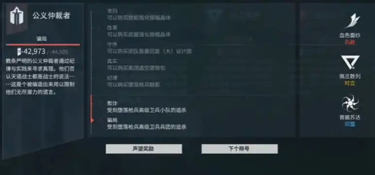 公义仲裁者的目标是解除帝国所赋予的目的束缚,建立一个可以自行生活,权力自由的新规则,主武器为终极螺钉步枪,副武器为终结螺钉双枪。
