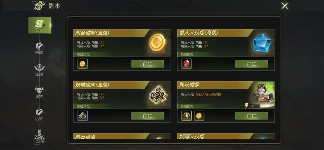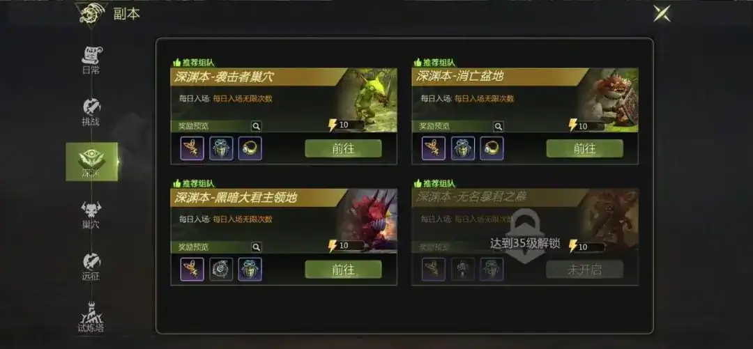 1、深渊及细缝,大家可以日常挑战深渊副本还有混沌缝隙,深渊本15级就解锁了,在等级提升后逐步开启,24级之后或32级能开启混沌缝隙,可单人进行,也能组队进入副本挑战,这两个副本主要产出地狱犬的门票,材料,还有金币,不论是提高实力,还是获取金币材料,都非常值得去体验。
