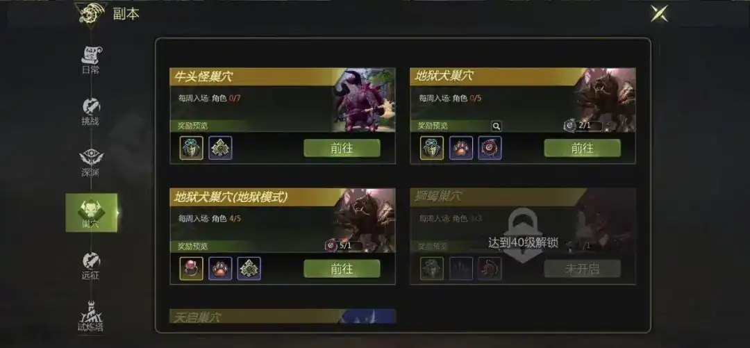 2、勇闯巢穴,以上的副本获取门票后,就可以去挑战地狱犬了,这个副本的普通难度,以及地狱难度每周都有5次,如果通关了副本,还能获得满级的毕业套装,还有其他的资源材料奖励。
