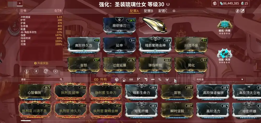 这套配卡的思路是在保证235%技能范围的与100%持续时间的同时,尽可能的提高技能强度与技能效率。玻璃甲设计上是防御地图炮战甲,所以技能范围越大越好。