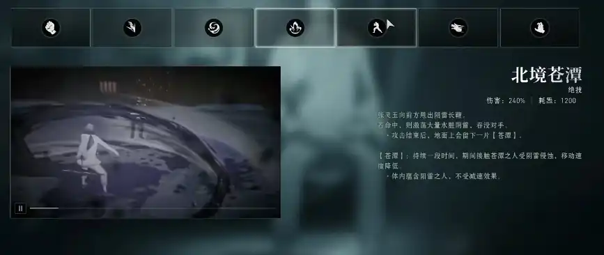 北境苍潭技能向前甩出阴雷长鞭,命中后会在地面形成一个水脏阴雷的区域,敌人进入这一区域后会被吞没并减速,具有较强的控制效果,可以在团战中为队友创造有利条件,同时也可以用于单挑时限制敌人的移动。