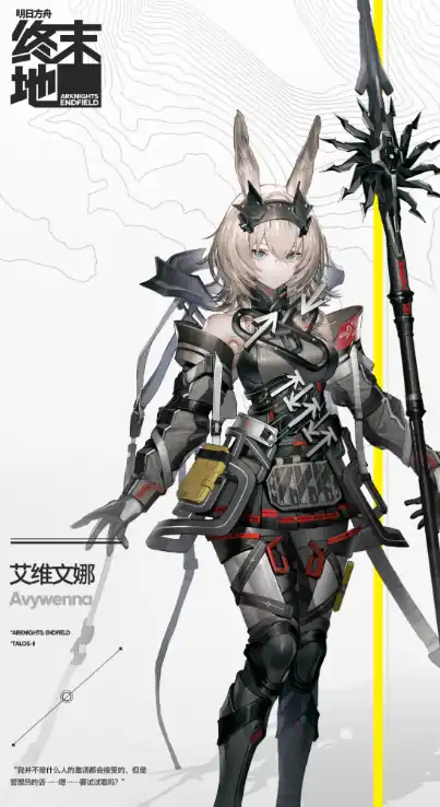 艾维文娜开朗自信同时也擅长社交,但是她习惯于他人保持一定的距离,让关系只停留在普通朋友的阶段,她的主动技会挥舞着长枪回旋,让自己周围的敌人遭受到攻击力280%的脉冲输出值,她的终结技会投掷武器,让附近敌人遭受到伤害后,这个武器还会在场上停留10秒的时间,这段时间可被视作脉冲能量来使用。