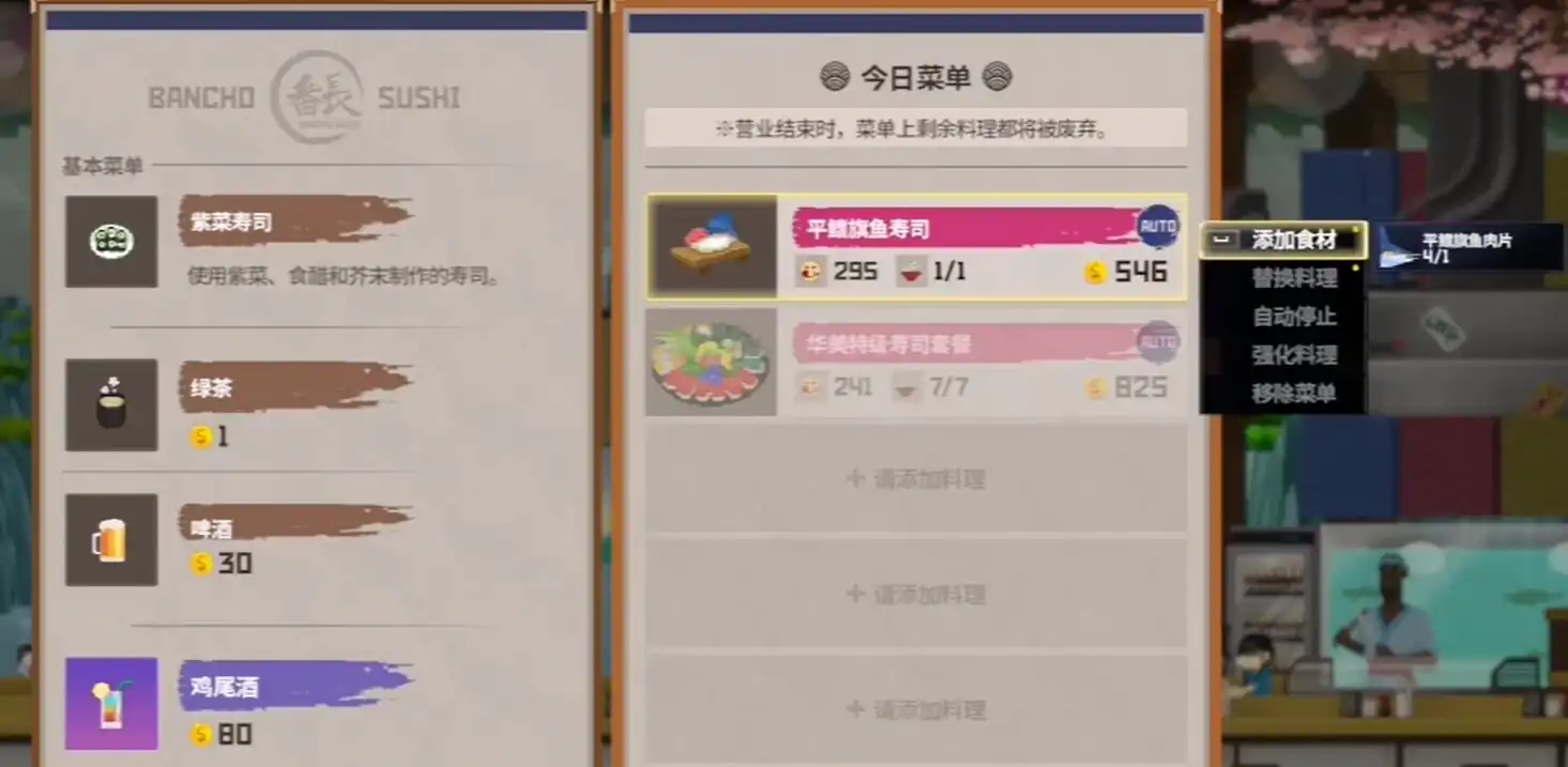 一句话来说,“自动供应”就是帮你从仓库中自动调取食材,免去了手动补货的麻烦。每天寿司店开门前,你需要提前准备当天的食材库存,如果开启了自动供应功能,那么当店里的食材不足时,系统会自动从仓库里调用剩余的食材,直接填补库存。如果这个功能没有打开,就意味着当食材用光时,店员只能抱歉地告诉顾客“无货”,你不仅会失去顾客满意度,还会浪费原本可以赚取的收益。