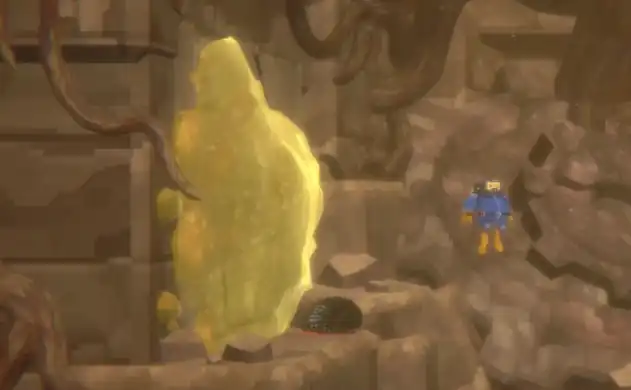 接着进入一个新房间,你会遇到一只脾气暴躁的海虾。这家伙不好惹,但打败它后,树上的树脂球就会变成你的工具。用它砸向地面的树脂口,一次性解决掉障碍,顺利通往下一层。