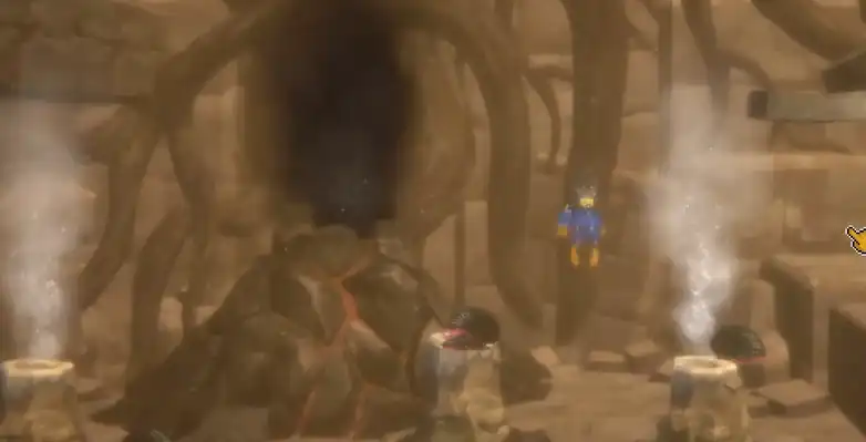 来到左侧的房间,这里的解谜需要点手速。附近有三只硬甲虫,把它们快速放到三个气口上,堵住喷出的气流。时间要抓得紧,不然可能会重新来一遍。当气口全被堵住后,房间里的火山会喷发,喷出的岩浆将炸开高处的石顶。