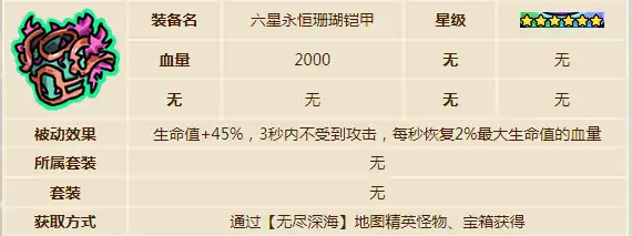这一个装备可以有效提供2000点的血量,此时就可以在短时间内提升角色的生存能力。可以额外增加45%的生命值,并且如果在三秒的时间内没有受到外界的攻击,在此时就可以恢复2%的生命值血量。