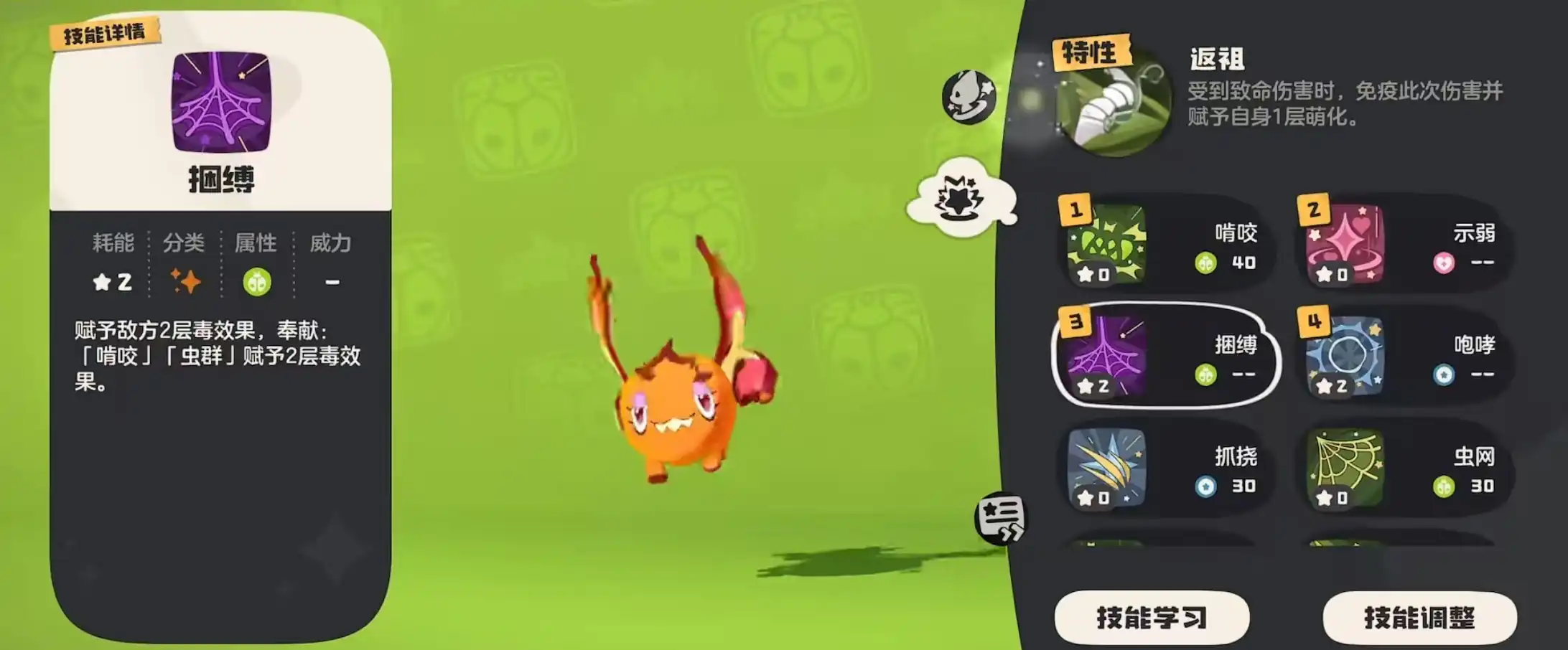 虫击,造成物理伤害,应对时无视敌方的系别抵抗。虫鸣,除了造成魔法伤害外,队伍中每携带一只带有此技能的精灵,连击次数就能增加1。应激反应,能回复30%血量,应对时回复达到90%。示弱,萌化自身,速度提升100%。装可爱,萌化自身,降低敌方50%物攻和物防。月之亮面,在自身带有萌化状态时,威力提升。