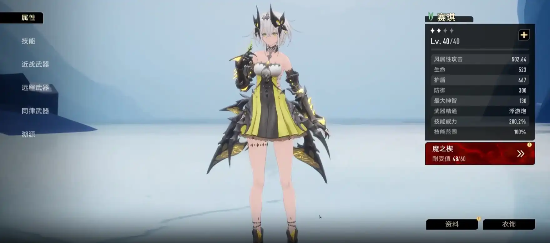 赛琪是一名风属性的攻击型角色,整体造型黄色和黑色相搭配,非常的抢眼,风属性的攻击力非常的高。召唤技能“茧中幻境”,向前突进,并在原地召唤1个“幻象”,“幻象”同时最多存在1个,此技能可在任意时机释放,且不打断当前动作,“破茧”状态中,此技能被替换为“逐光”,她会向前突进,发射32个“浮光鳞粉”,该物品在被发射后会自动锁定1个随机的敌人,命中打出风属性伤害。