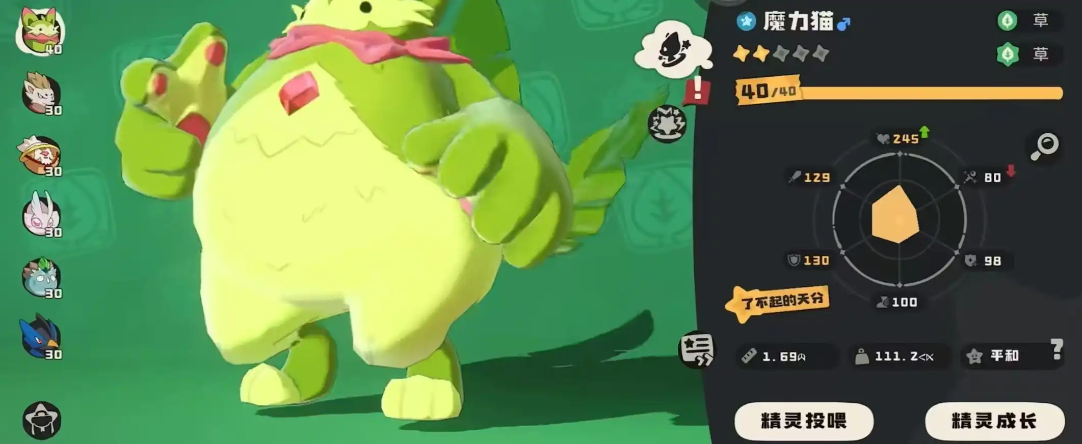 先来看一下魔力喵的种族值和特性方面的情况。特性是氧循环,当释放草系技能时,回复15%生命,这个特性就非常出色了,只要释放的是草系技能,都可以获得生命回复,完全可以打持久战。在种族值方面总和为606,特点是每一项属性都非常均衡,最少的魔攻为88点,最高的物防109点,分布得非常均匀。而且是在游戏初期就可以直接获取的宠物。