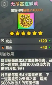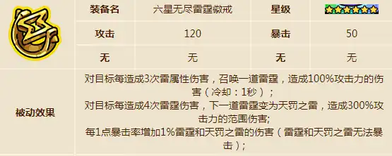 在针对目标每造成4次雷霆伤害之后,那么下一道雷霆就会直接变成天罚之雷,此时就会造成300%的攻击力范围性伤害。每一点暴击率都可以得到1%的雷霆,还有天罚之雷的伤害,但是玩家需要知道这两者是没有办法暴击的。