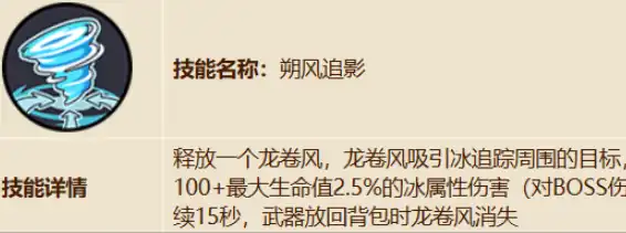 首先了解一下这把武器的基础性属性,移动速度可以增加100,会有250点冰攻击,一旦在释放攻击之后就可以把周围的敌人全部都吸附柱。朔风追影这一个技能一旦在释放之后还会形成一个龙卷风,会有15秒的时间。基本上每相隔半秒就会造成将近100点的基础性伤害,而且还会有冰属性伤害。