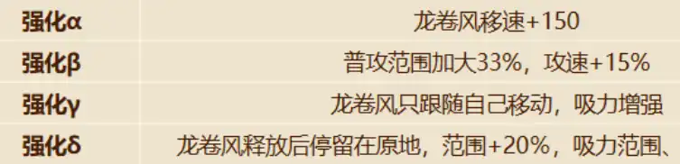 在改造时可以选择多个路线,例如选择强化α,可以有效让龙卷风的移动速度增加150,在清理分散的怪物时还是非常有用的,能够很快进入到敌人的周围,然后展开输出。