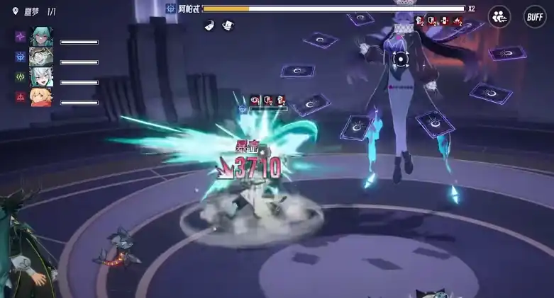 攻击结束后,RC-77还会为全体友方附加两回合的防御上升状态,使得队友们的防御力大幅提升60%,随着技能等级的提升,异变突袭的效果也会逐渐增强,当达到等级2时,驱散增益效果的概率增加至30%,等级3时伤害系数提升至70%,等级4时驱散增益效果的概率再次提升至35%,几乎每次攻击都能对敌人的增益状态造成干扰,最终在等级5时,技能冷却时间减少一回合,使得RC-77能够更频繁地使用这一强力技能。