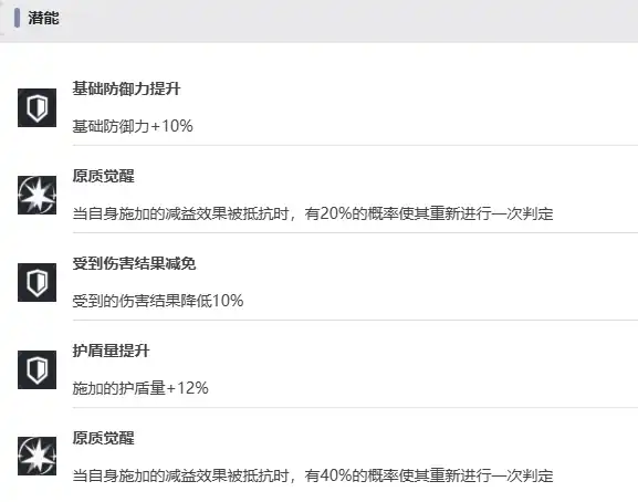 其次原质觉醒技能也得到了增强,当自身施加的减益效果被抵抗时,有20%的概率使其重新进行一次判定,此外受到伤害结果减免的效果也得到了提升,现在可以降低受到的伤害结果10%,这意味着角色在受到攻击时能够减少更多的伤害,提高生存能力,最后护盾量提升也是一个非常重要的改动,施加的护盾量增加了12%,这为角色提供了更强的保护。