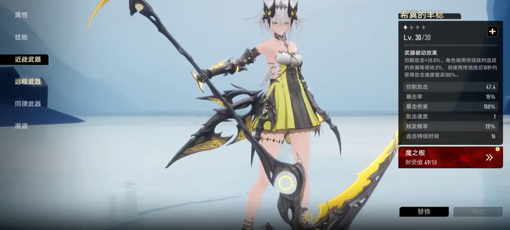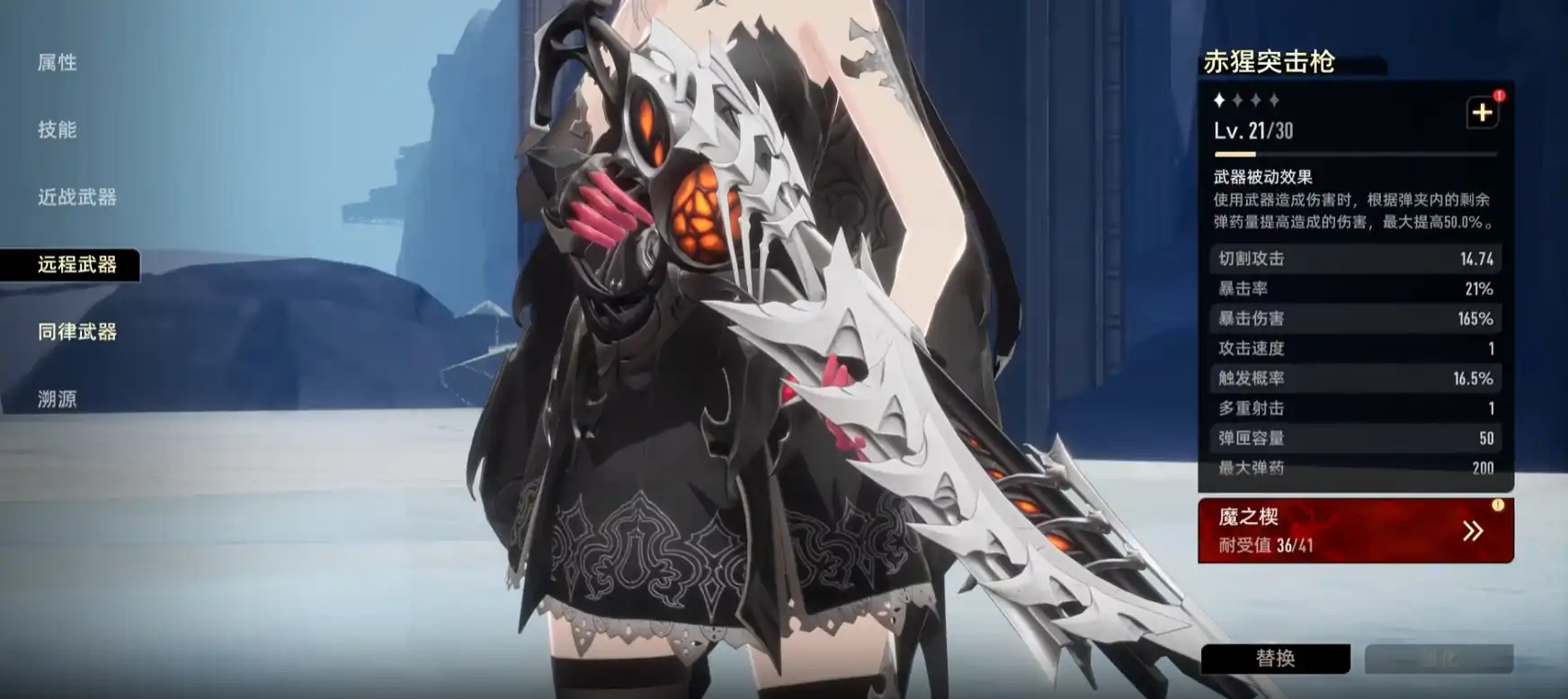 武器被区分为近战和远程两种,近战武器能反制身边的敌人,护卫自身的安全,可以使用近战武器进行蓄力反击。近战武器:重剑、太刀长柄,单手剑,鞭刃等。远程武器可用于击败远方和高处的敌人,取得制敌先机,远程武器有装弹数和弹药上限的限制。远程武器有:榴弹炮,霰弹枪,双枪,突击抢,弓等。